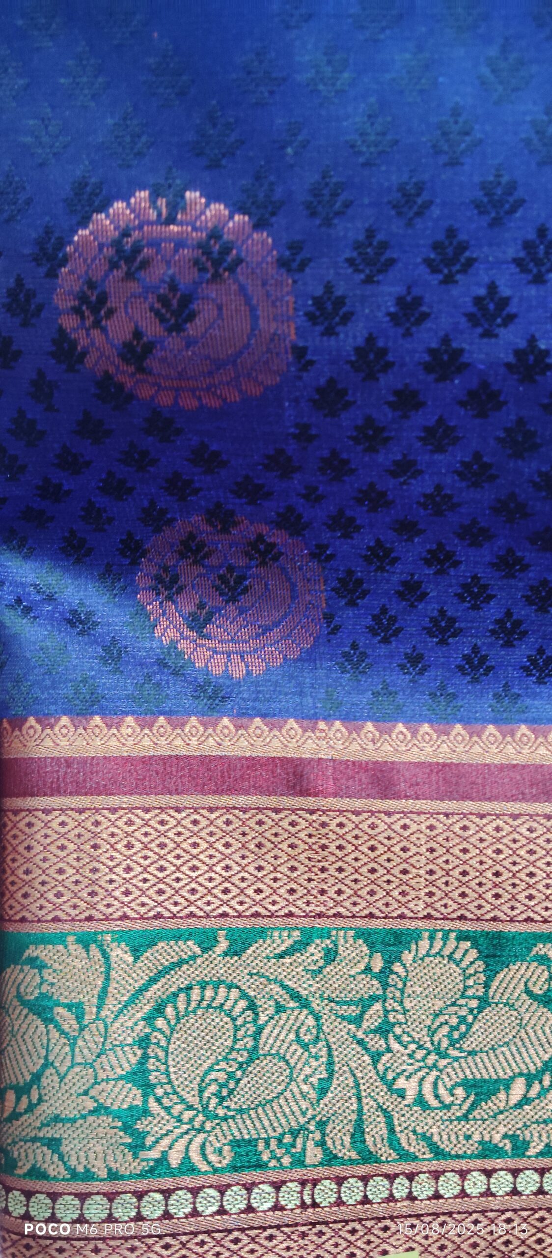 Step into elegance with this stunning Dark Blue Silk Saree, featuring a Grand RedPallu and a contrast blouse piece. The saree is adorned with intricate golden buttas all over, adding a regal charm to every drape. Its green border with red lines gives a striking contrast, making this saree a perfect choice for weddings, receptions, and festive occasions.