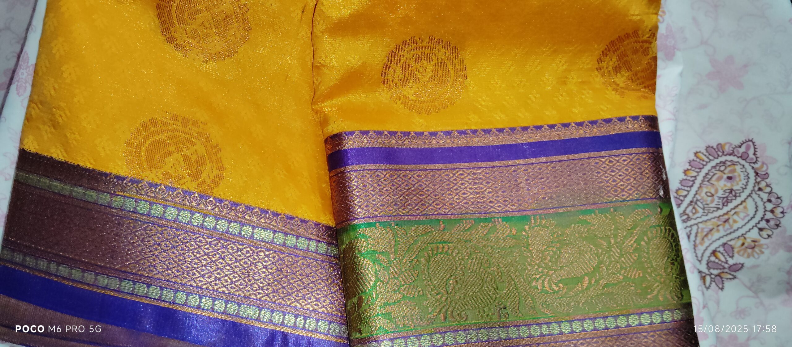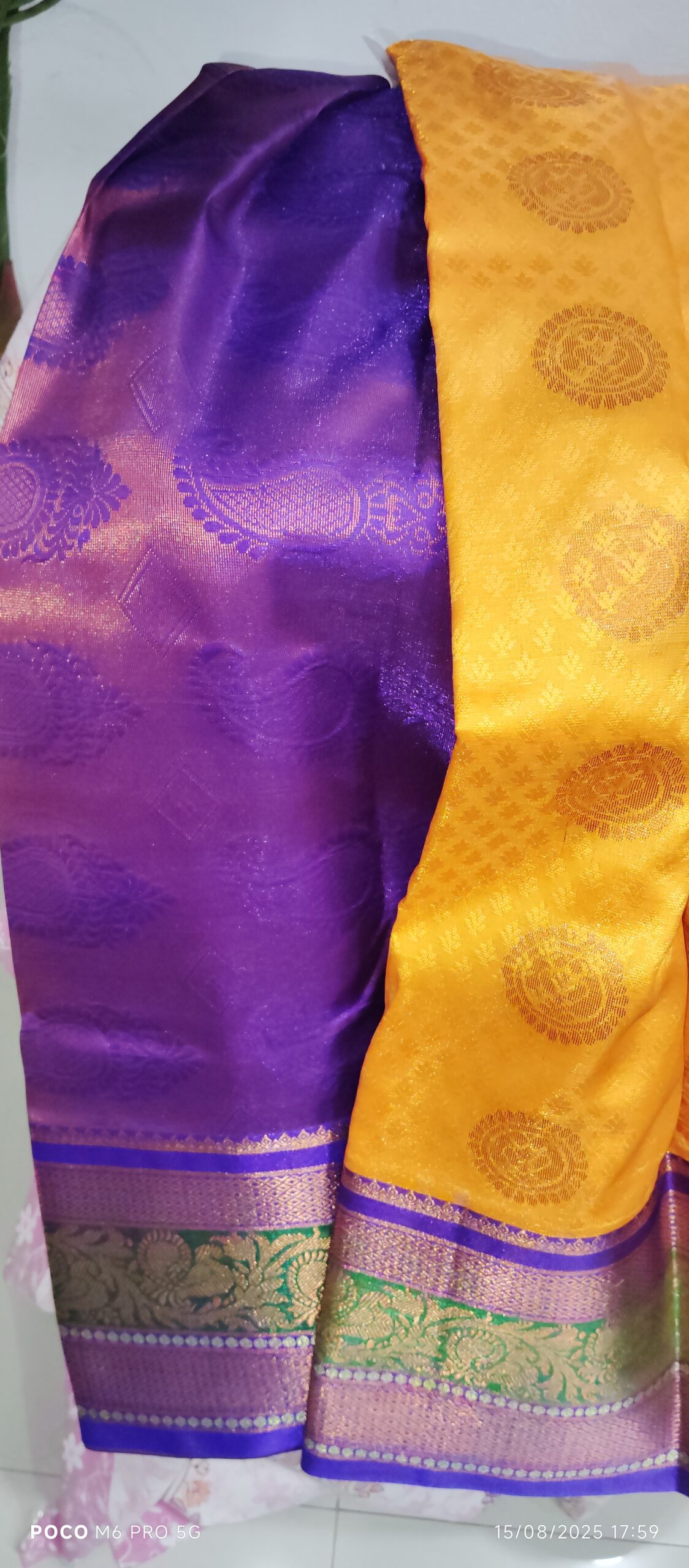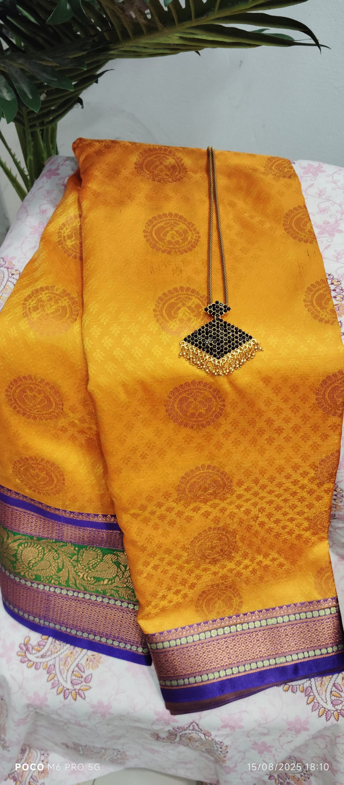 Step into elegance with this stunning YELLOW SILK Saree, featuring a Grand Violet Pallu and a contrast blouse piece. The saree is adorned with intricate golden buttas all over, adding a regal charm to every drape. Its green border with violet lines gives a striking contrast, making this saree a perfect choice for weddings, receptions, and festive occasions.